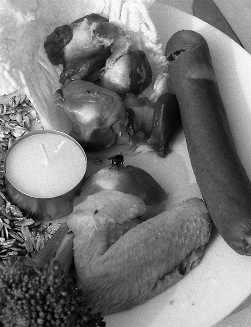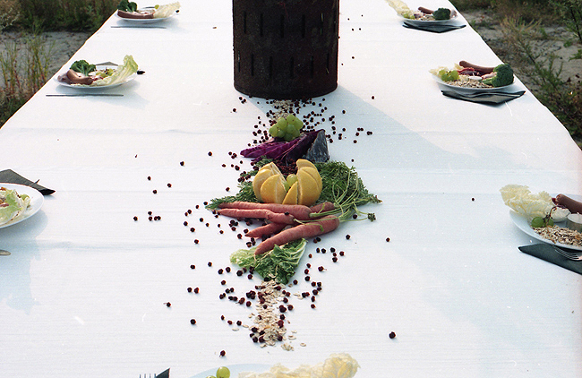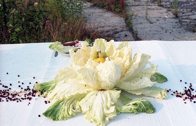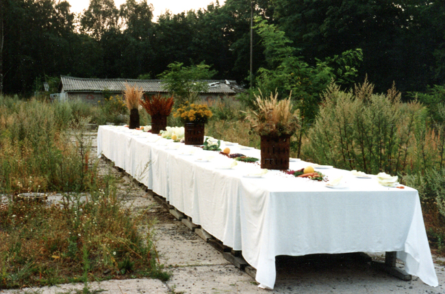 "Im Sommer 1994 war ein ehemaliges russisches Kasernengelände in Potsdam/Krampnitz Schauplatz einer künstlerischen Feldreise, zu der Ro.Ka.Wi. auf einem 12 m langen Bankett-Tisch 'Das letzte Ma(h)l' inszenierte... Bei dem Beitrag zu dieser Feldreise ging es um Zerstörung und Überwucherung, um Verschwinden und Verfall: eine Woche lang wurde per Video dokumentiert, wie sich auf diesem Brachgelände die Natur das Areal zurück eroberte. Denn hier war nach dem Truppenabzug nicht nur der Verfall des fortan ungenutztes Geländes zu beobachten, sondern analog dazu auf dem Bankett-Tisch auch wimmelndes Gewürm."