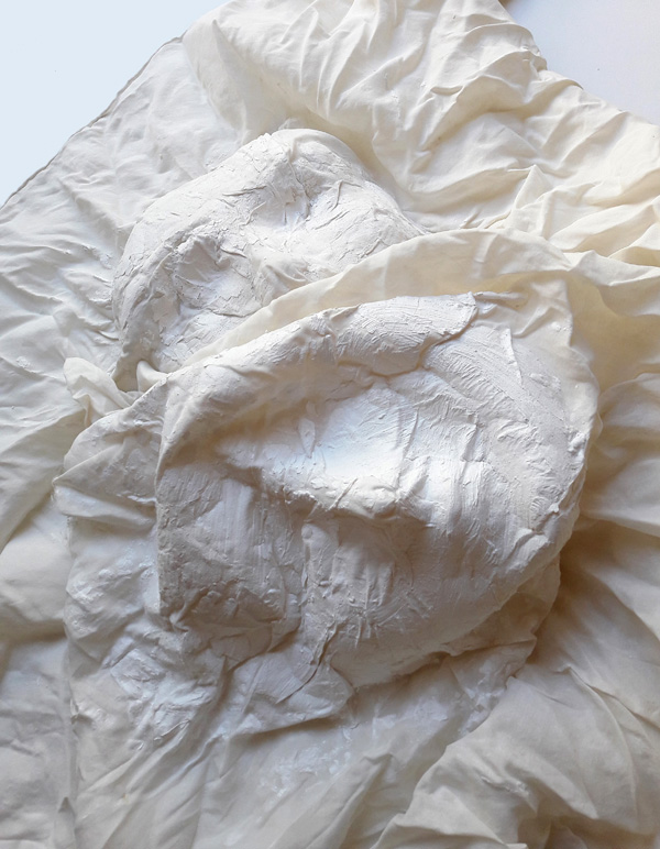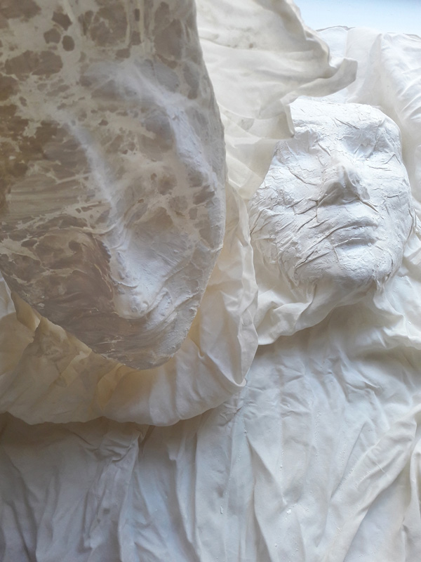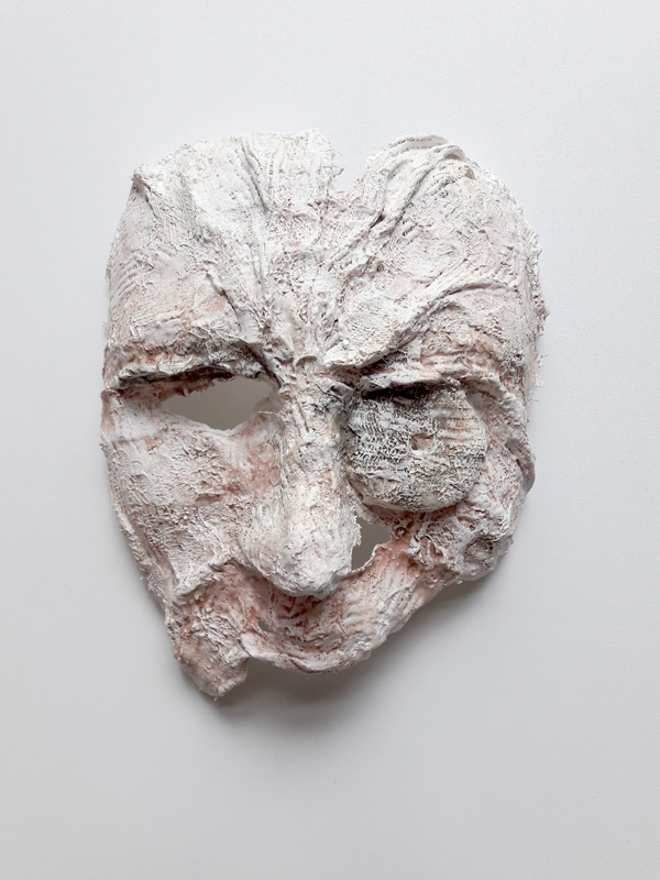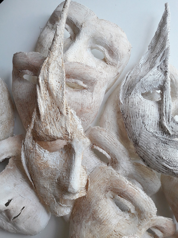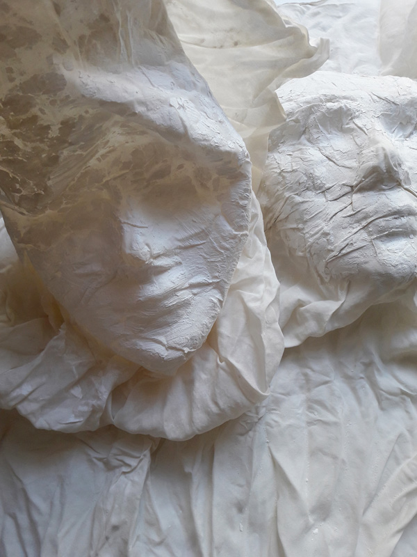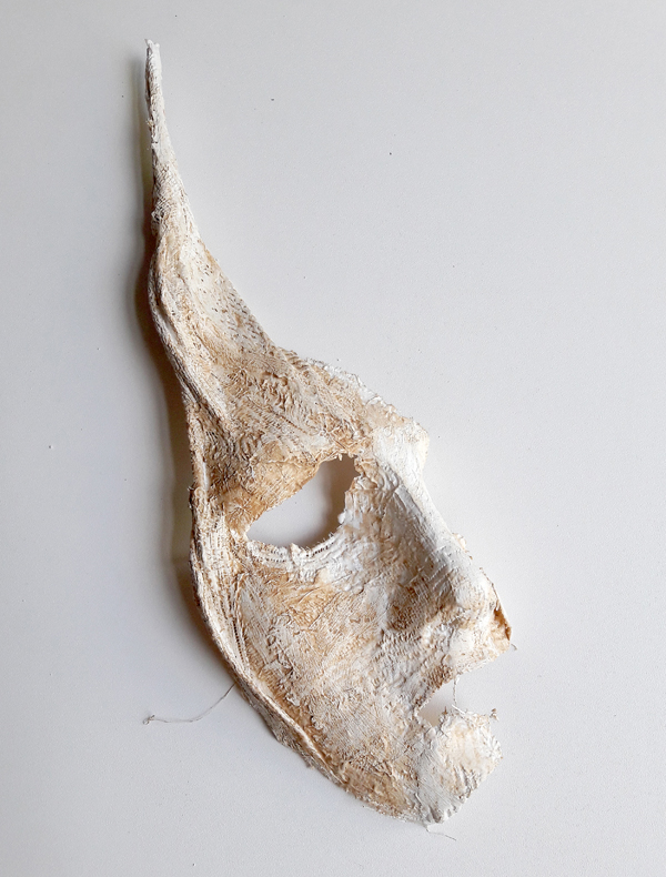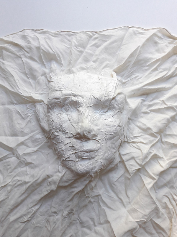 from the series installed rituals - masks faces/tales - objects, masks, drafts; silk, plaster